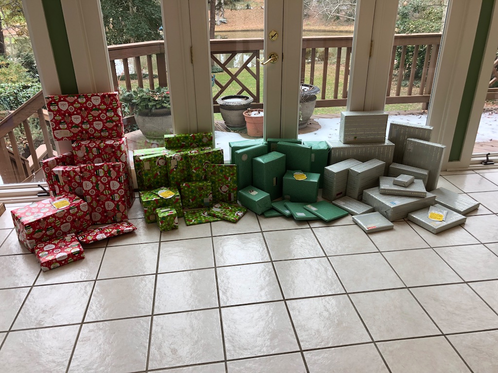 this year Susan and I selected four sisters from the angel tree at our gym to buy their Christmas. The ages ranged from 18 months to 12 years. We wrapped each child's presence in different paper. What a wonderful blessing to provide Christmas for these four girls! /hugh