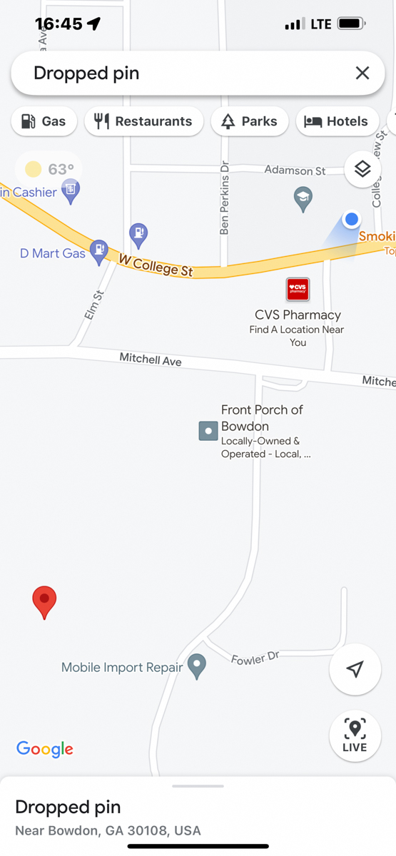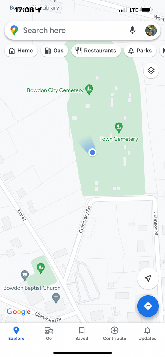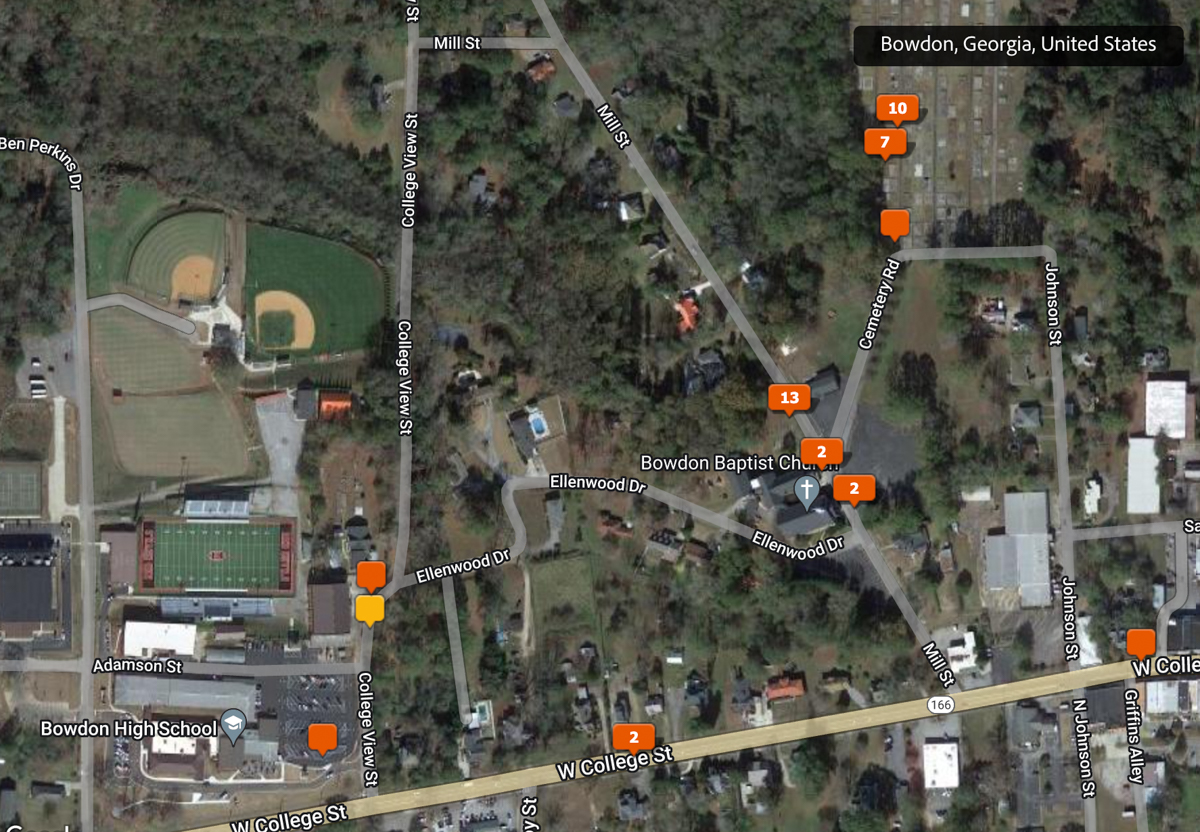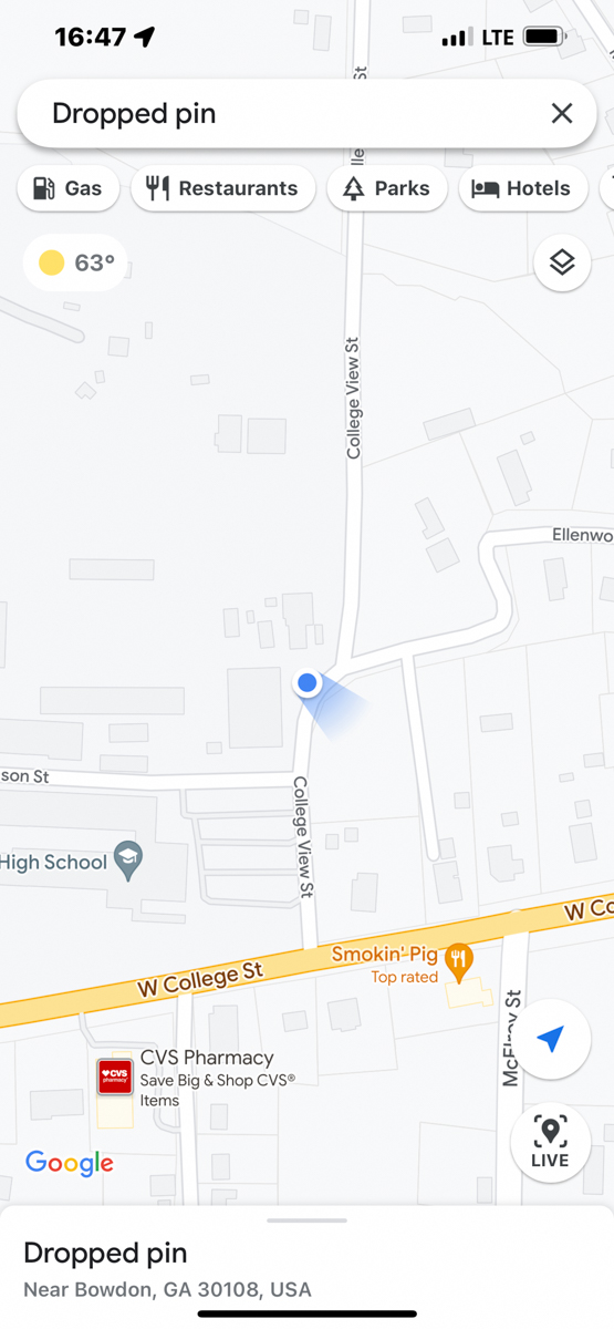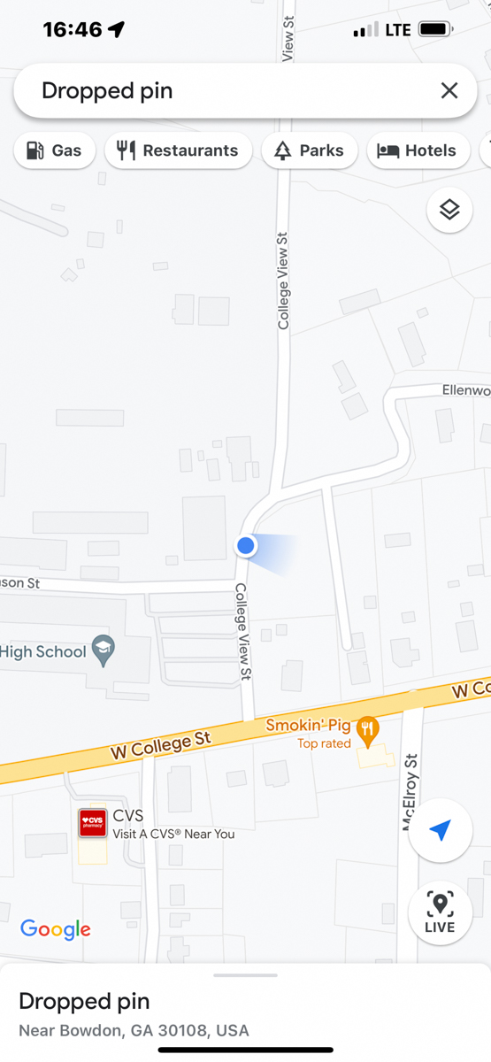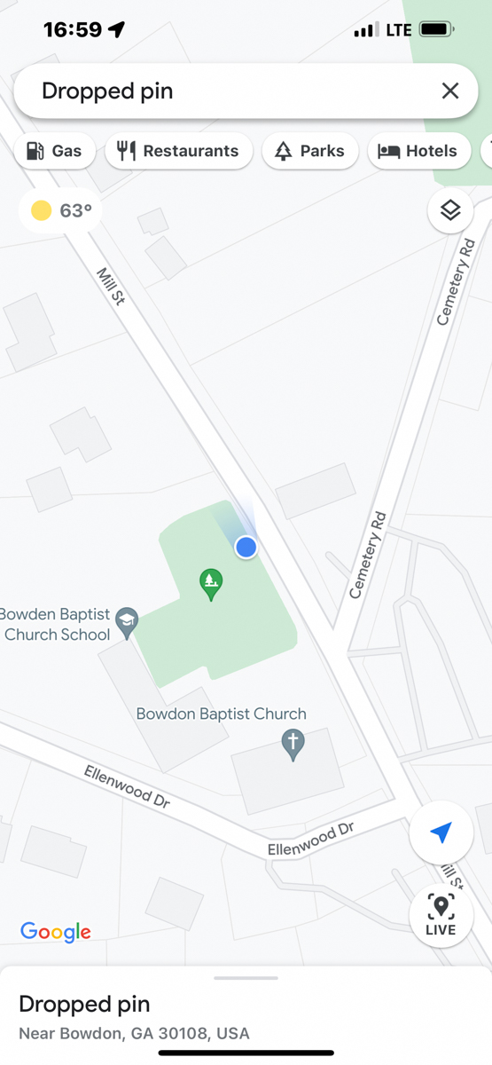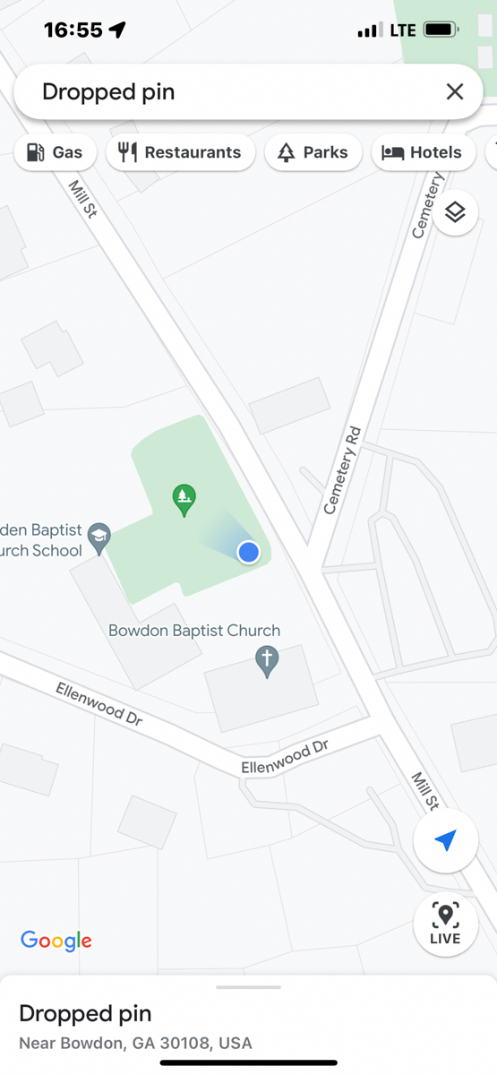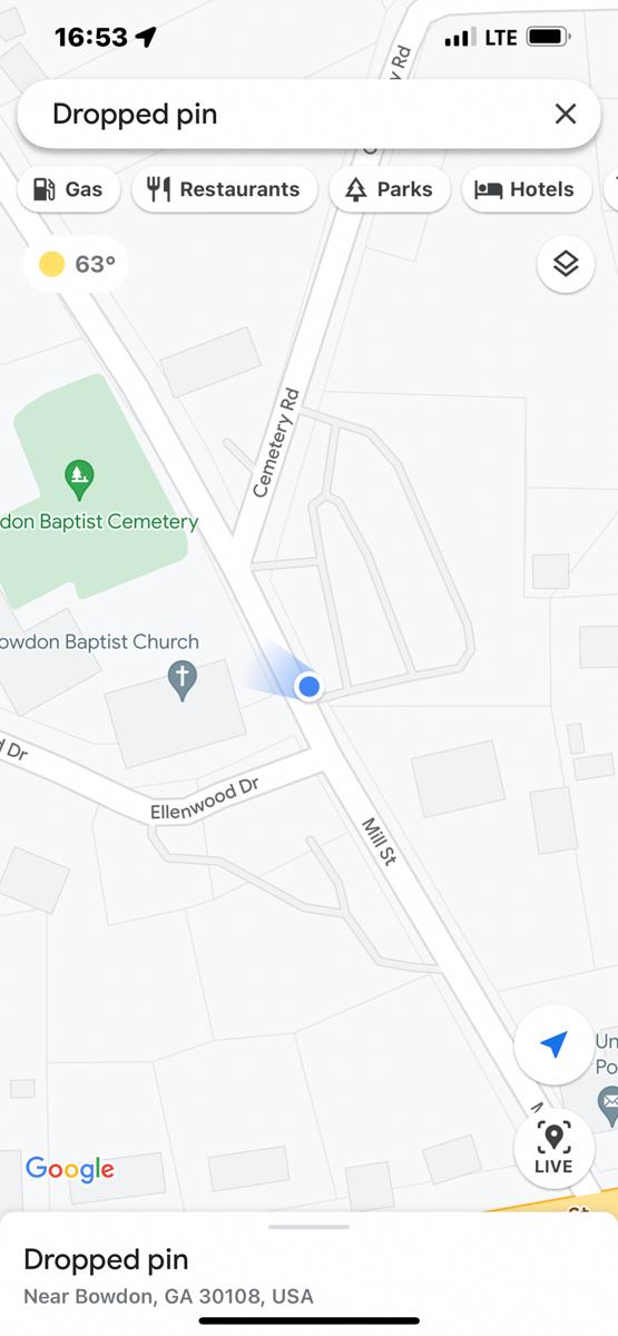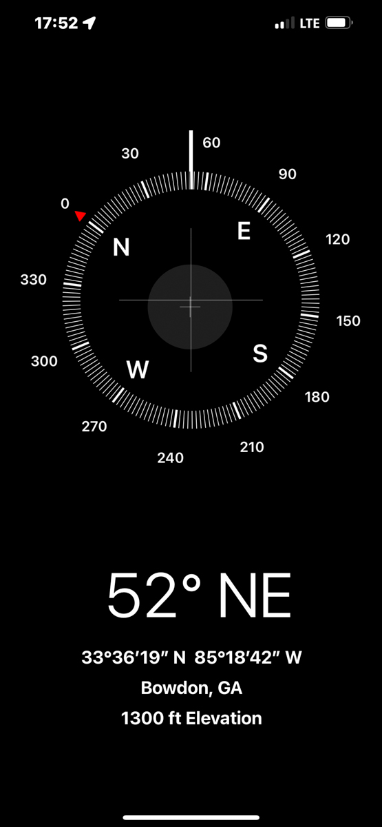 Both of my parents grew up in Bowdon, Georgia and are deceased. Today I rode my motorcycle around documenting the locations of graves, houses, and other significant sites in Bowdon. The compass and coordinates are in the location & direction I was standing as I took the predeeding photo. /hugh